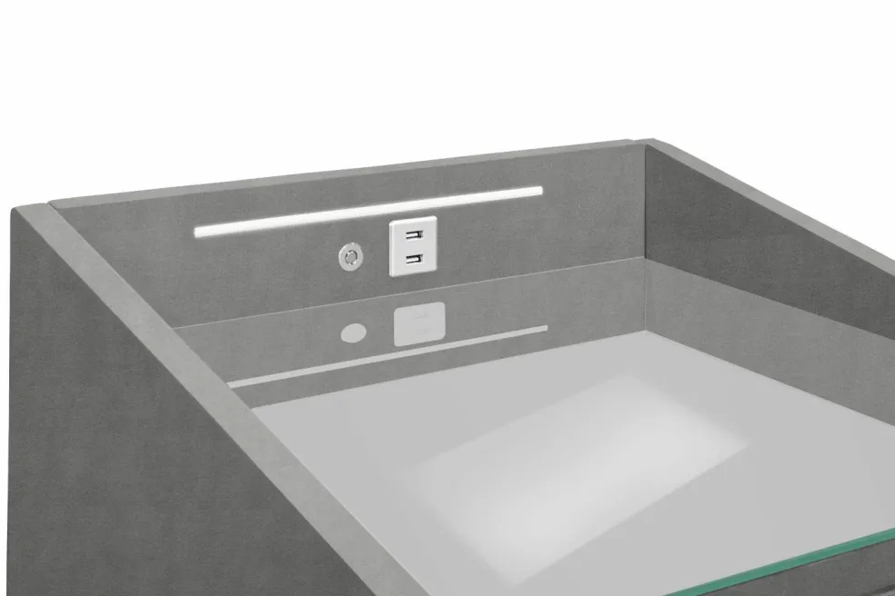 | Équipement Commodes Phono Bureau Étagère: | Plateau en verre, Tiroirs, avec port USB, incl. éclairage | ||