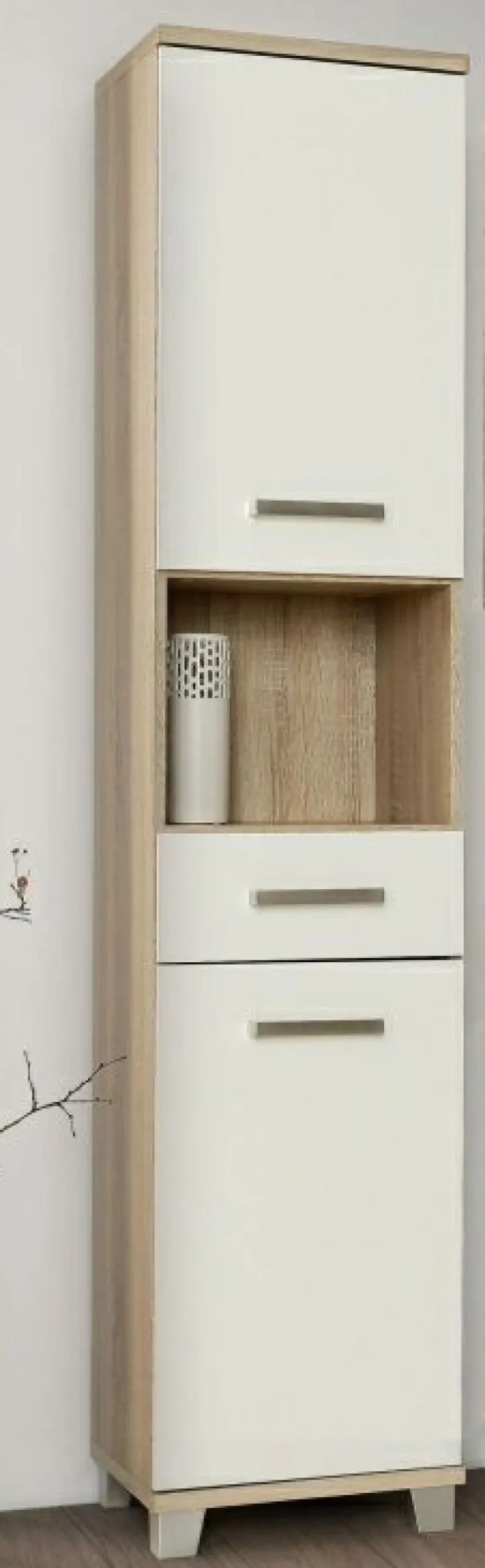 Cette colonne de salle de bains VERIS offre beaucoup de place pour le rangement du maquillage et des serviettes. Son design clair et convivial crée une formidable ambiance bien-être.
