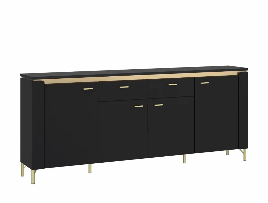 Caisson : ton noir et contrastes ton doré, plateau en MDF, panneau de particules surfacé mélaminé (PPSM)