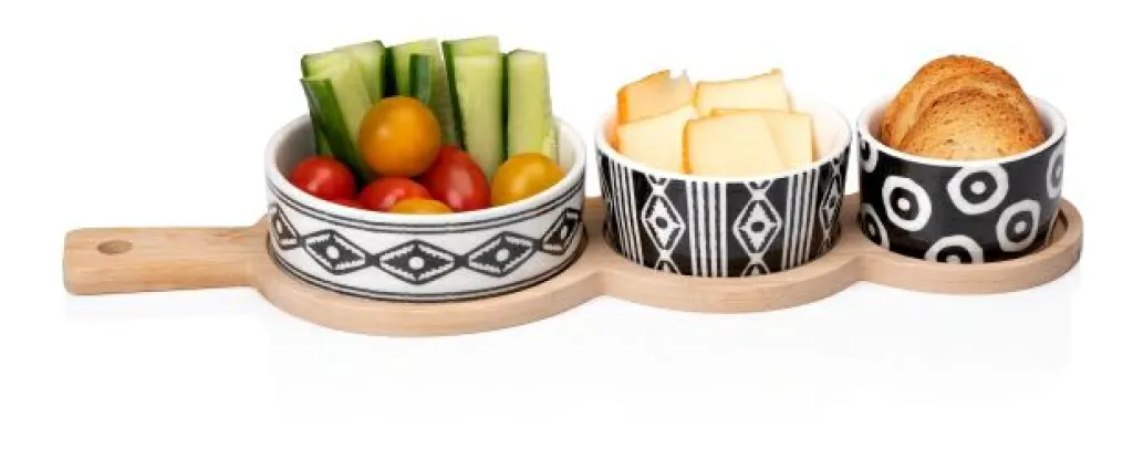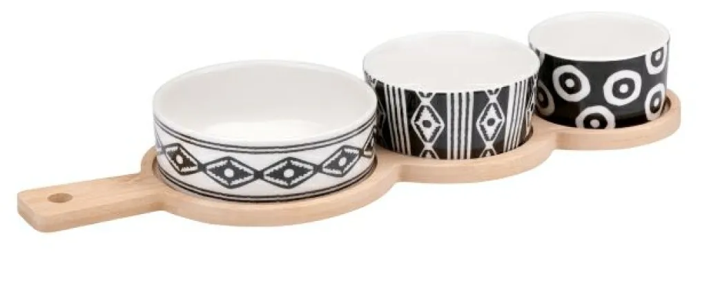 1 ensemble à tapas 4 pièces comprenant 3 ramequins et 1 plateau en bois