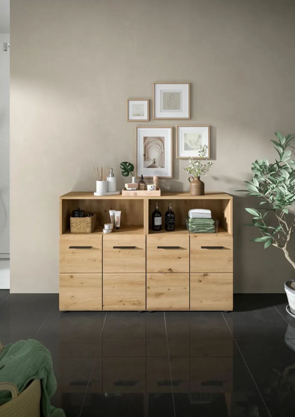 2 meubles de salle de bains avec, chacun, 1 casier ouvert, 2 portes et 1 tablette amovible
