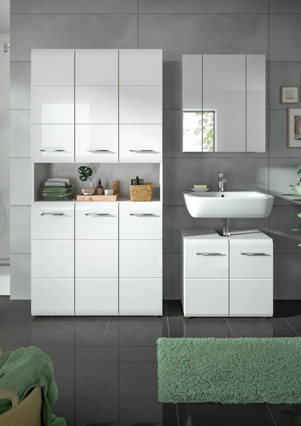 1 armoire de salle de bains avec 6 portes, 8 tablettes amovibles et 1 casier ouvert