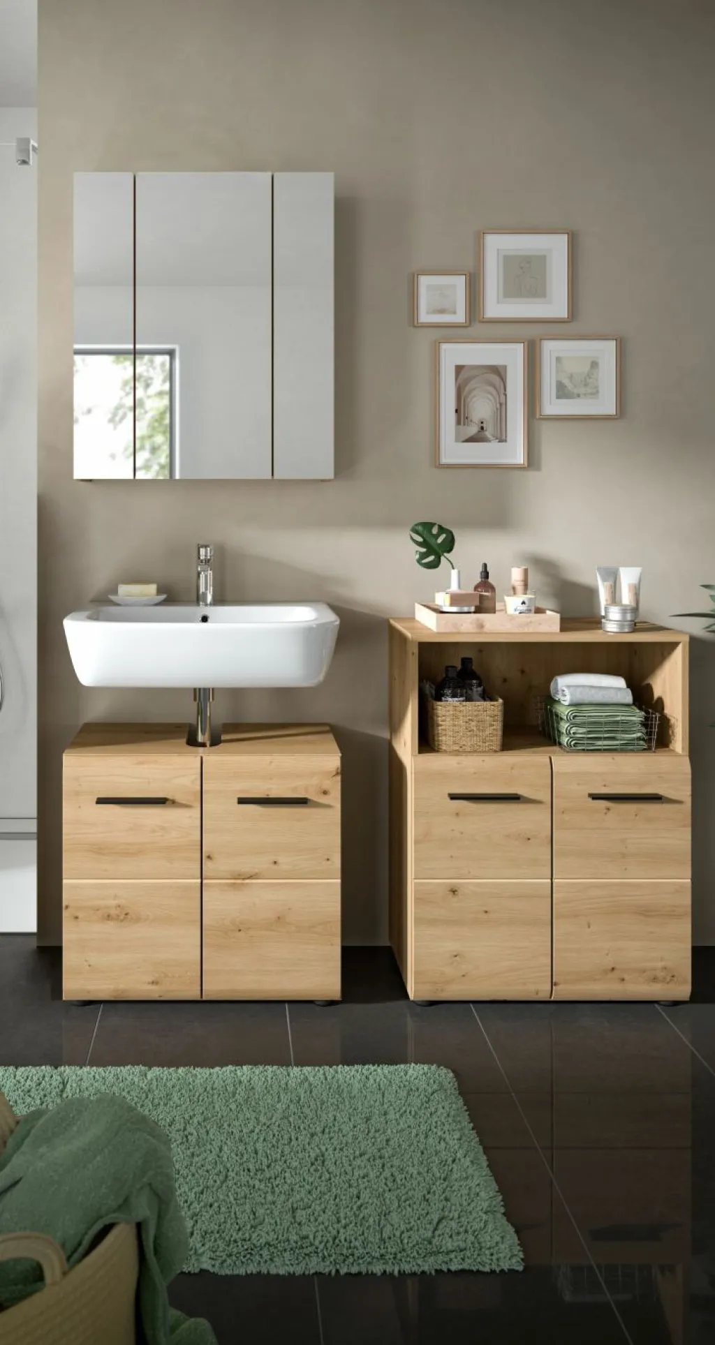 1 meuble de salle de bains avec 1 casier ouvert, 2 portes et 1 tablette amovible