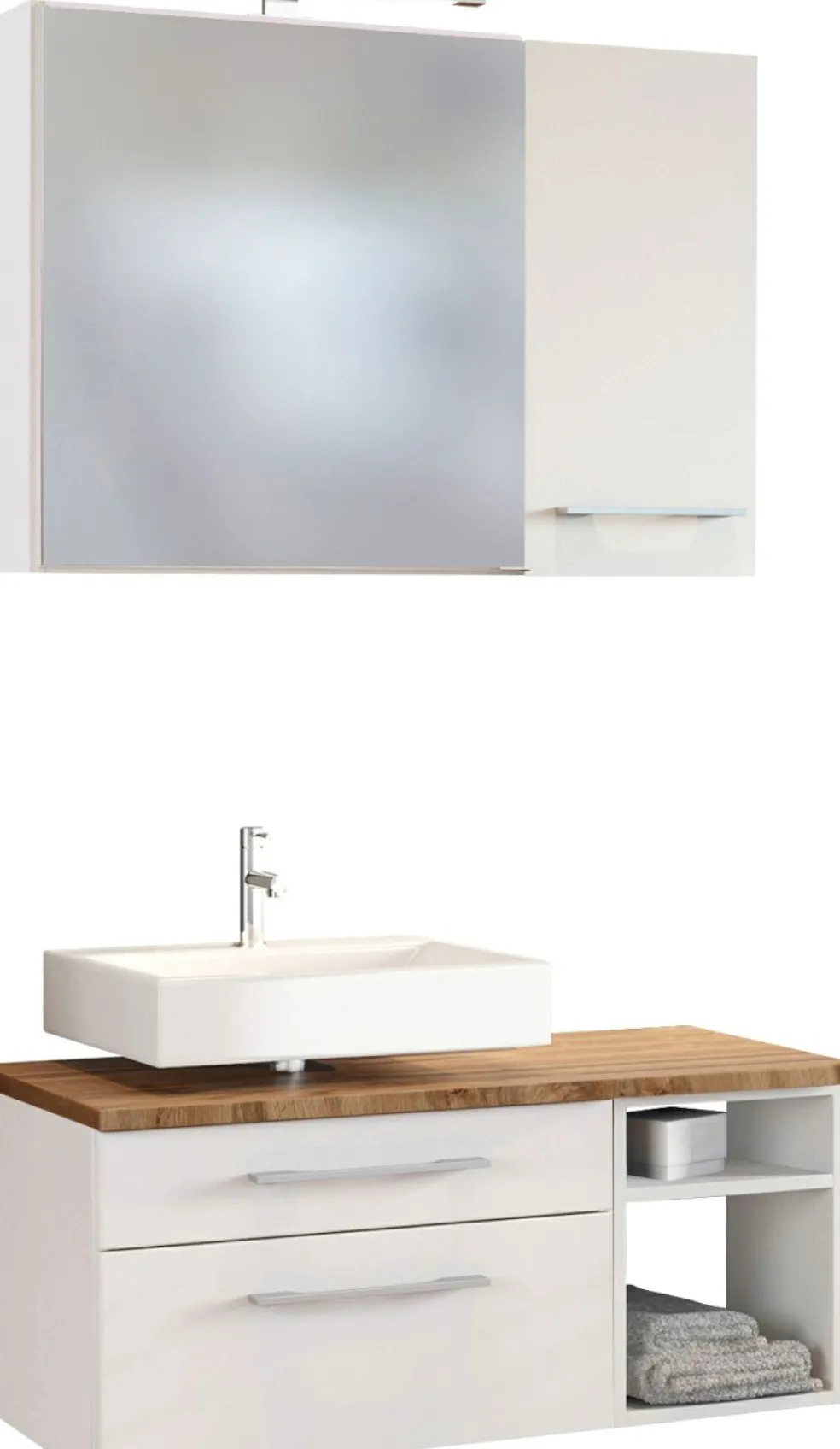 1 meuble sous vasque avec 1 tiroir bas et 1 tiroir haut avec fermeture amortie et 2 casiers ouverts, incl. découpe siphon à gauche