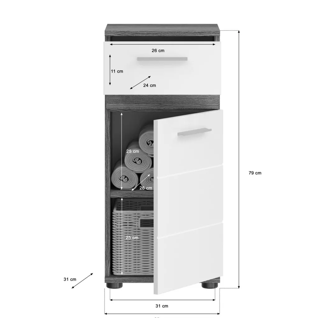 1 meuble de salle de bains avec 1 tiroir, 1 porte et 1 tablette amovible