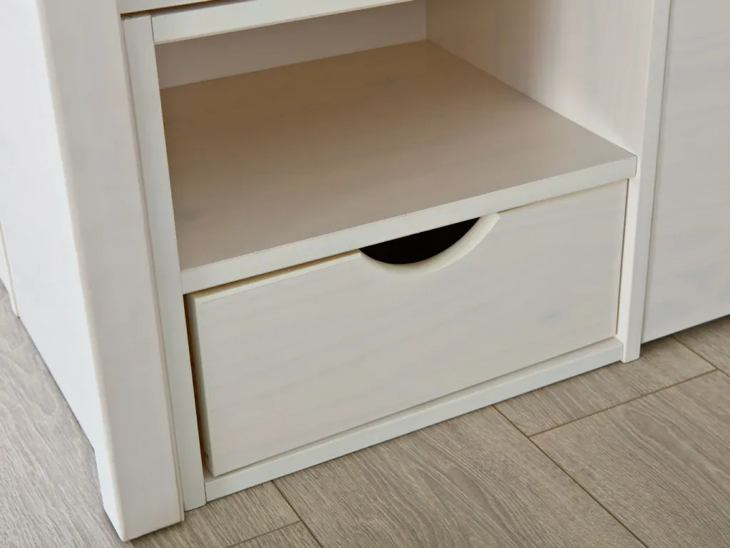 - Lit bien pensé avec un système de rangement ultra pratique : quatre tiroirs, douze casiers et deux chevets à roulettes pouvant se ranger sous le lit