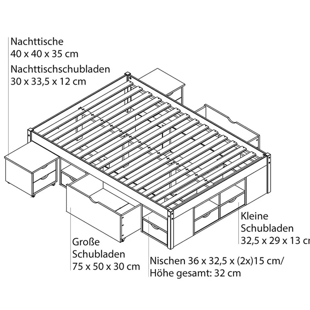 | Equipement lits: | Tiroirs, incl. chevet(s), incl. sommier à lattes | ||