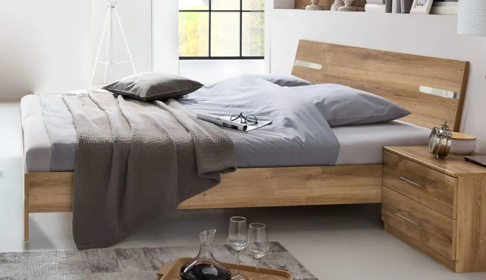 Caisson et façade : décor planches de chêne avec lattes ton chrome brillant