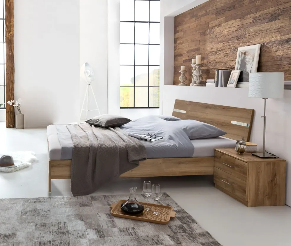 Caisson et façade : décor planches de chêne avec lattes ton chrome brillant