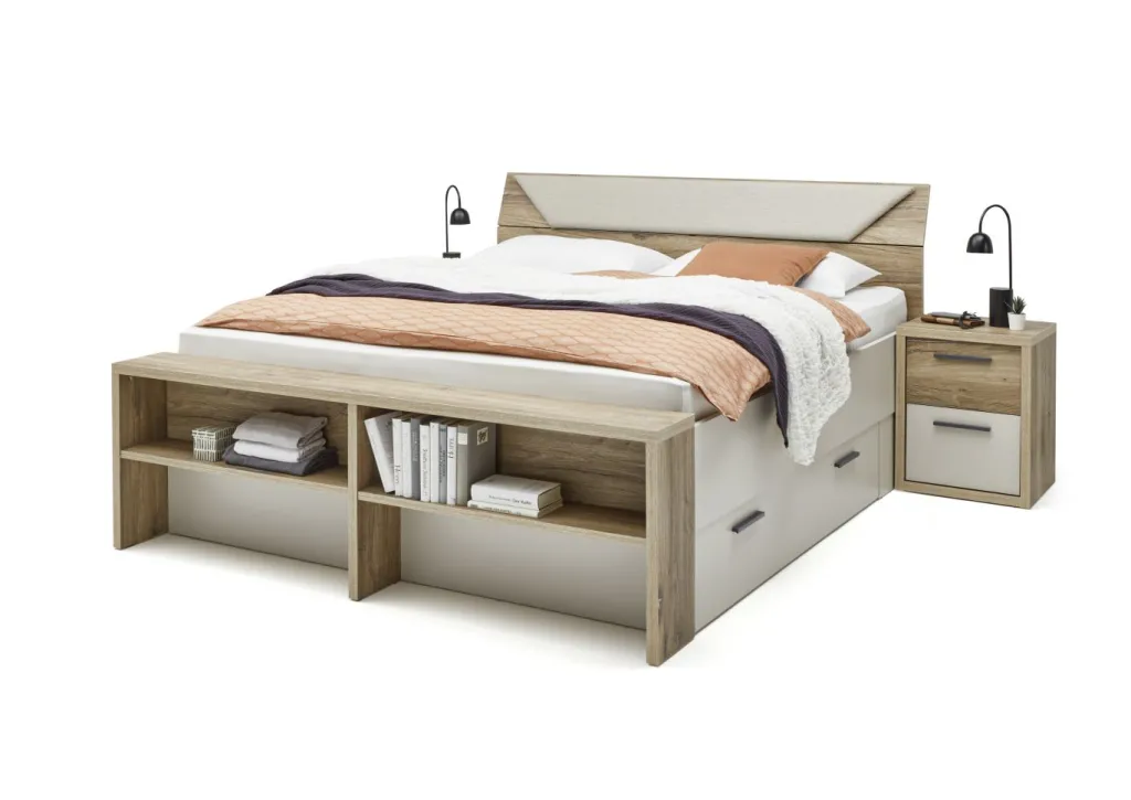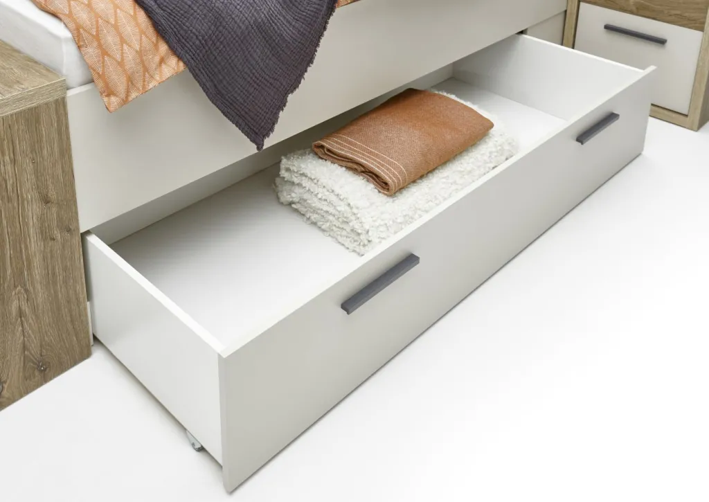 Inclus : 2 tiroirs et 1 étagère au pied du lit