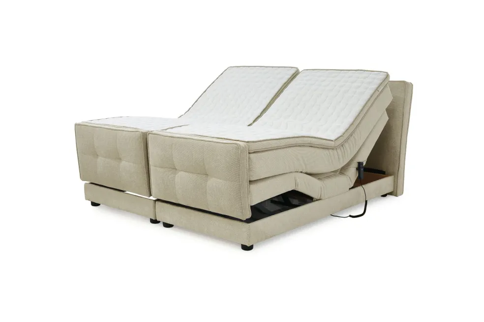 Le point fort de ce lit boxspring est indéniablement le réglage électrique. La télécommande ultra pratique permet de régler facilement la position de couchage favorite grâce à une multitude de réglages de la tête et du pied de lit. La tête et le pied de lit décoratifs sont joliment réhaussés d’un passepoil double.Outre son joli design, le pied de offre l’avantage d’empêcher le matelas et le surmatelas de glisser lors du réglage (électrique) du lit.