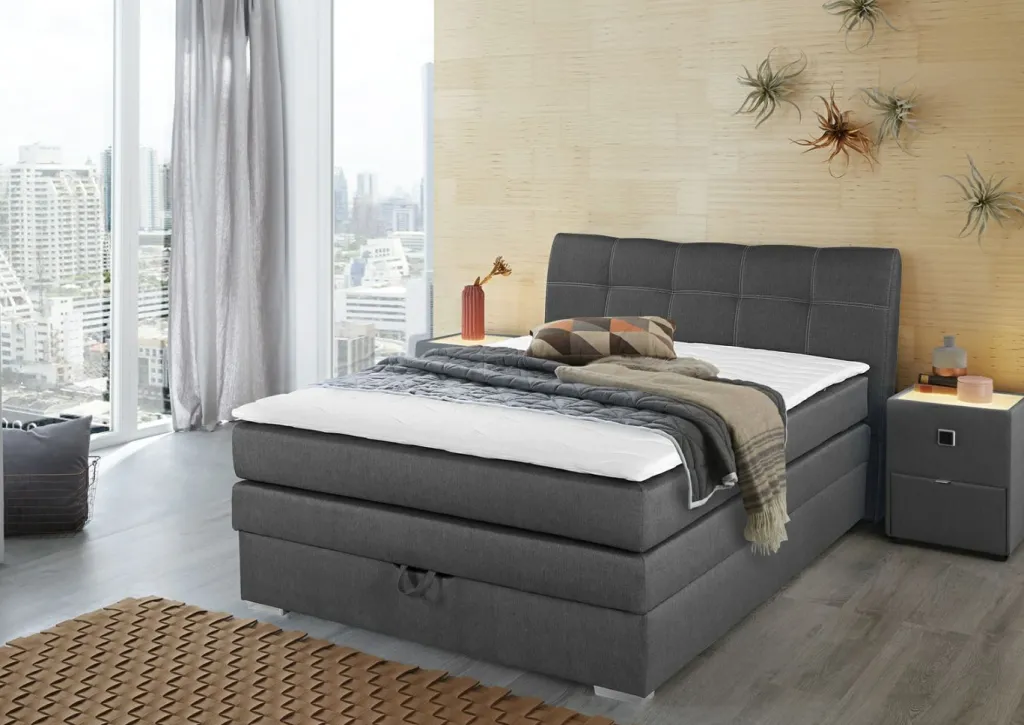 La structure de ce lit boxspring est composée d’un caisson et d’un cadre de lit relevable avec garnissage à ressorts Bonnell. Sur cette base se trouve un mtelas à ressorts bonnell. La double suspension ainsi formée crée un confort unique avec une adaptation optimale à la morphologie du dormeur et à la pression corporelle.Le surmatelas en mousse polyuréthane apporte la touche finale à ce lit boxspring