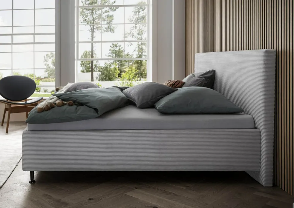 2 coffres de lit de qualité avec garnissage en mousse et habillage en tissu d’ameublement
