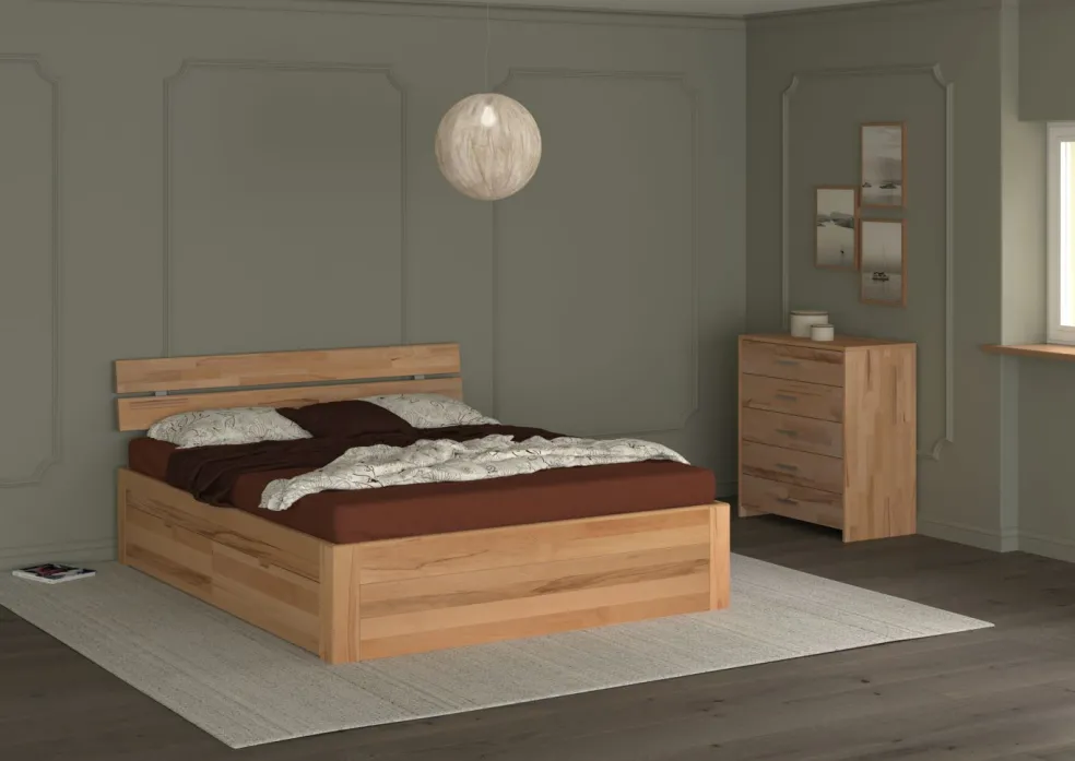 Cadre de lit et tiroirs : cœur de hêtre massif (Pologne) ton naturel, huilé