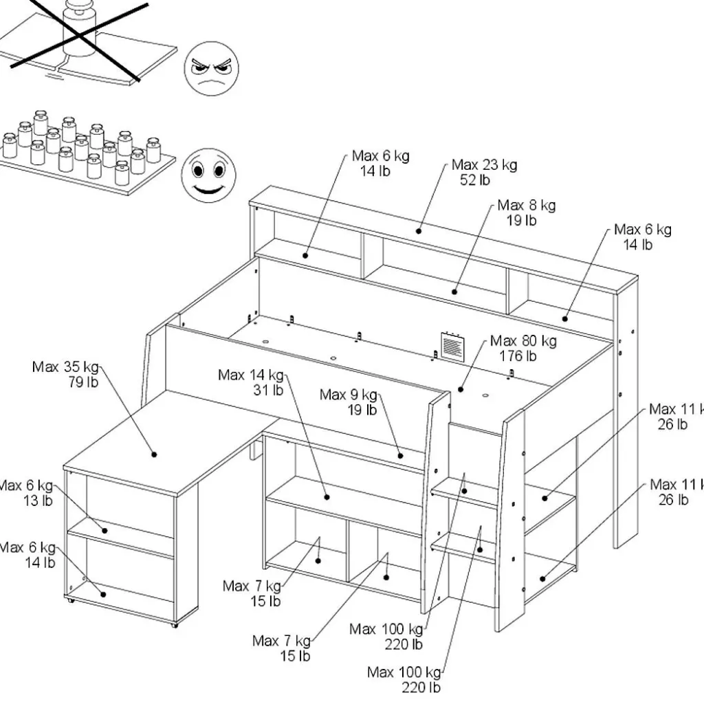 | Lit mezzanine avec bureau ouvert | 209 | 140 | 210 |