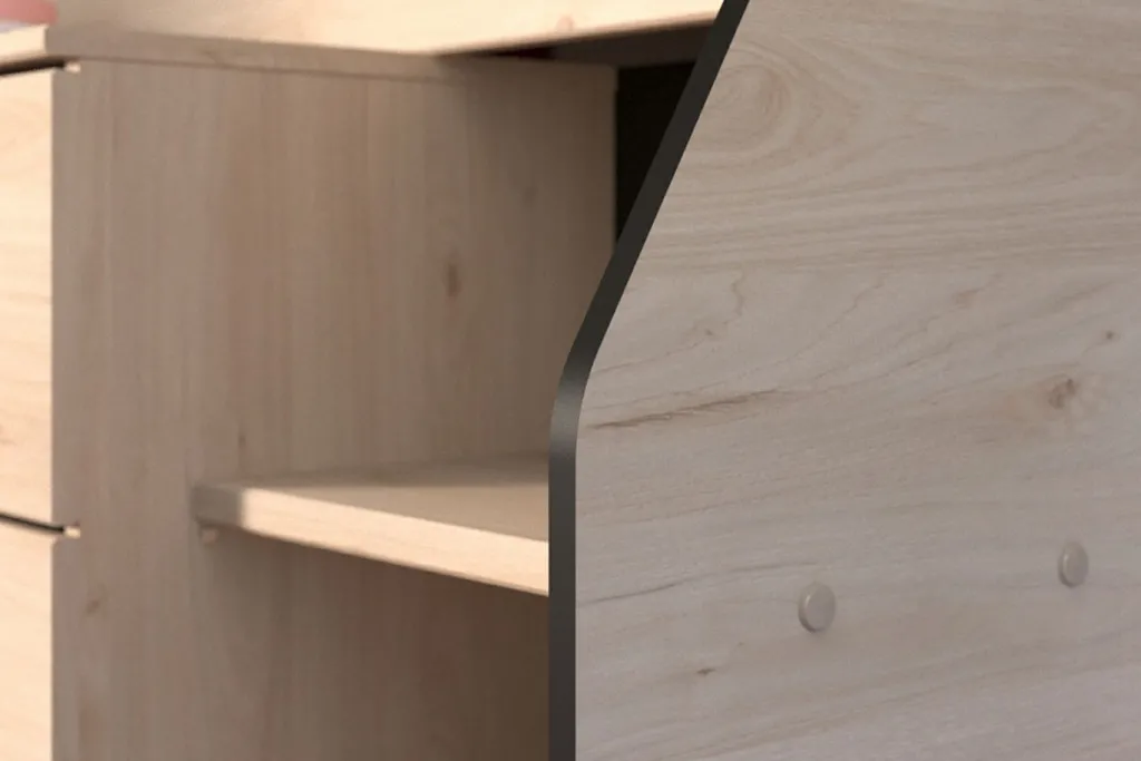 côté gauche du lit : plateau utilisable comme bureau avec bords chanfreinés