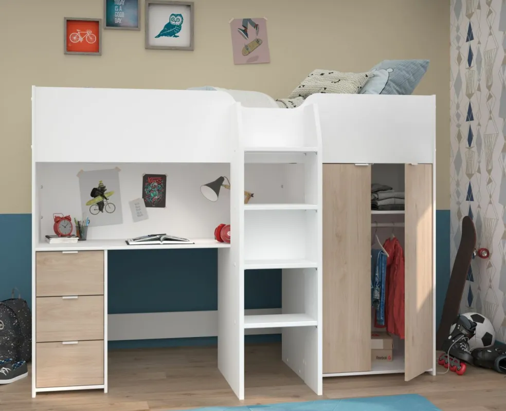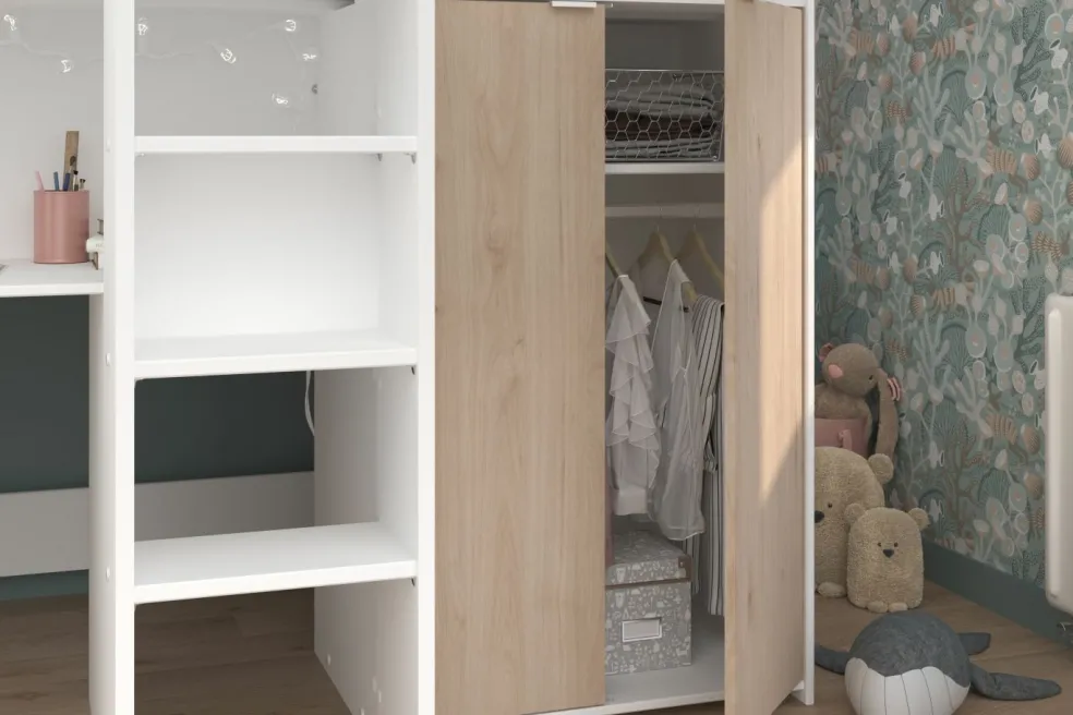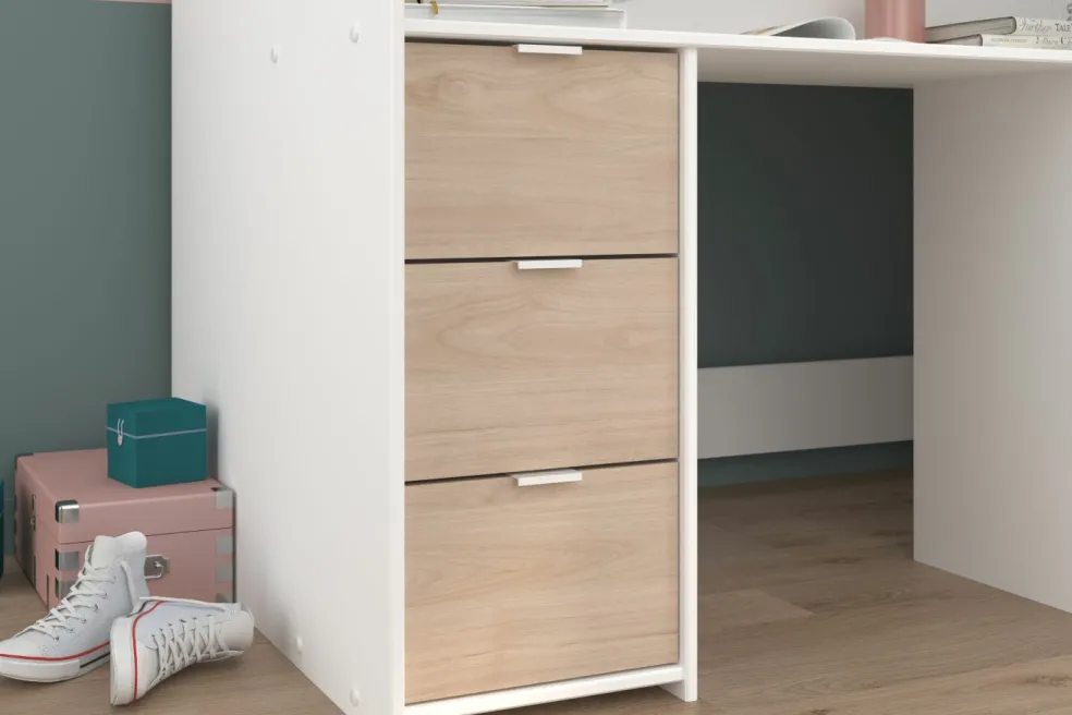 1 bureau intégré (à gauche sous la surface de couchage) avec 1 grand plateau, passe-câbles et 3 tiroirs