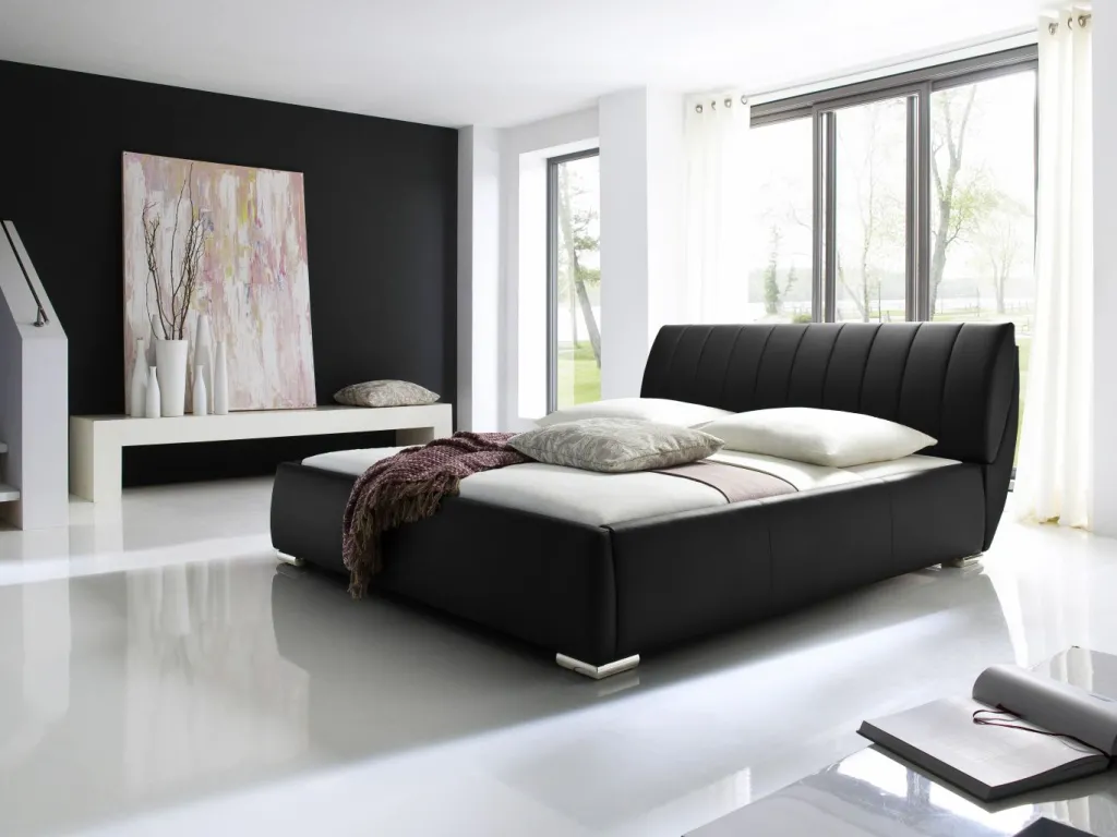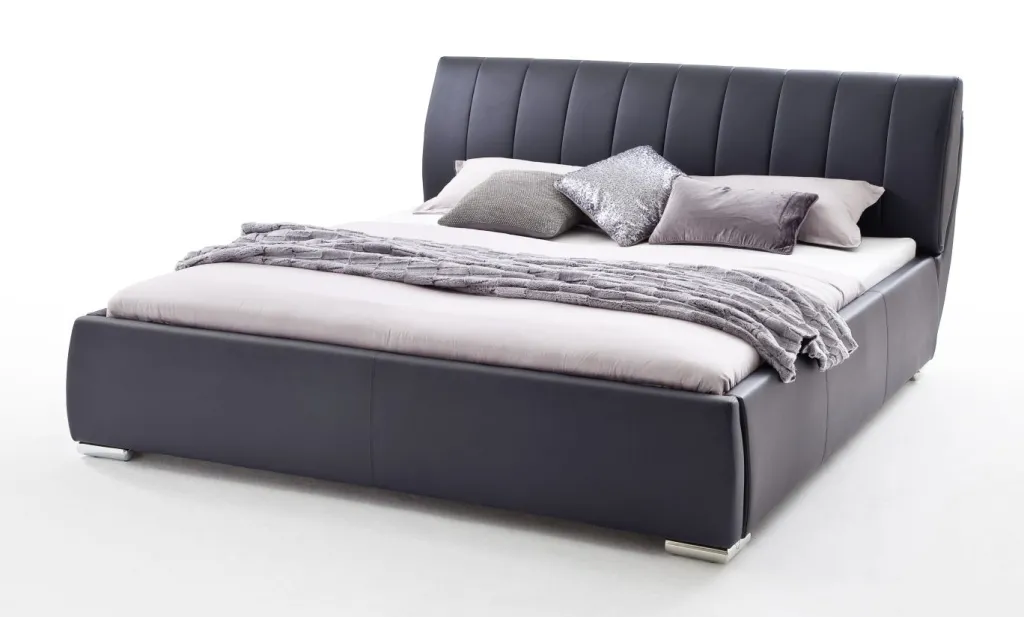 Lit rembourré ton noir avec revêtement en cuir synthétique : face avant 100% polyuréthane, dos : 50% coton, 50% polyester