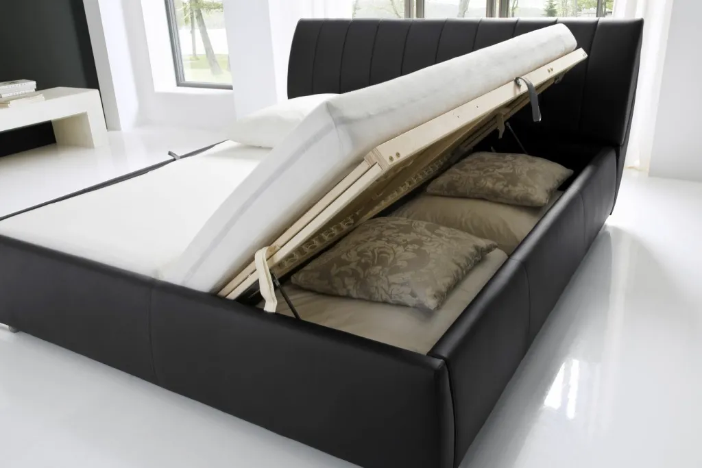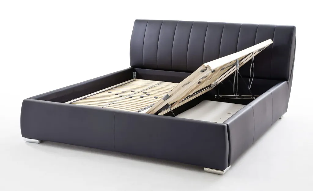 inclus : coffre de lit et sommiers à lattes s’ouvrant sur les côtés