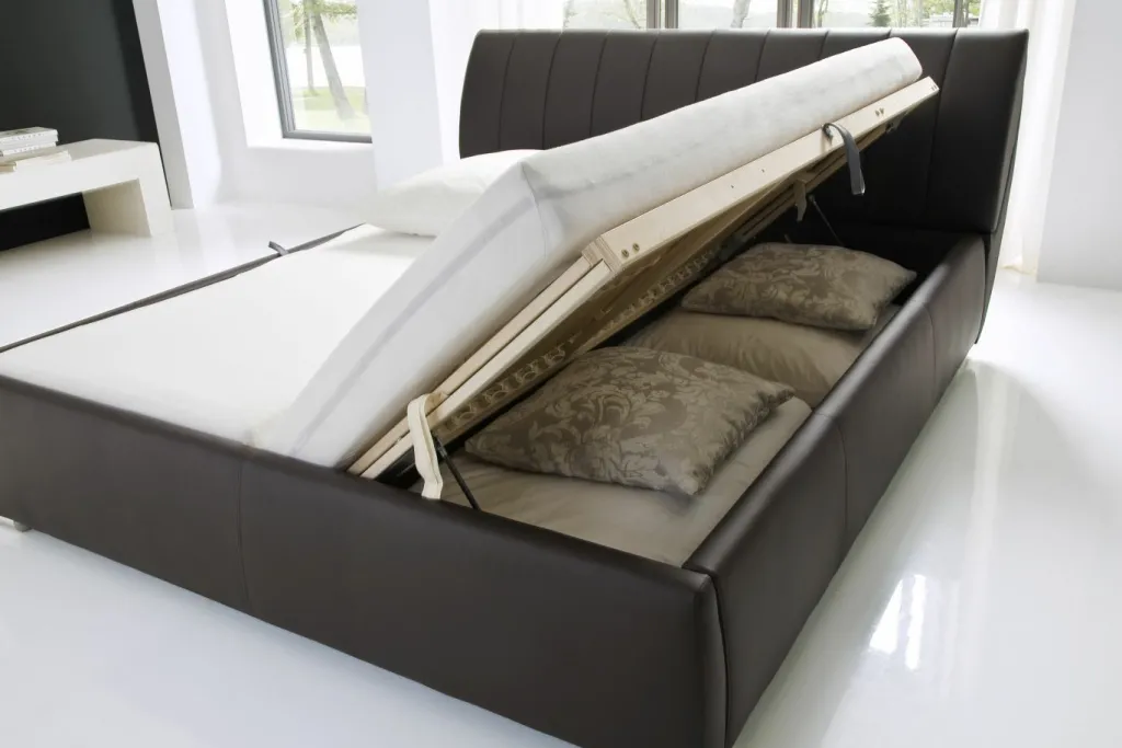 inclus : coffre de lit et sommiers à lattes s’ouvrant sur les côtés