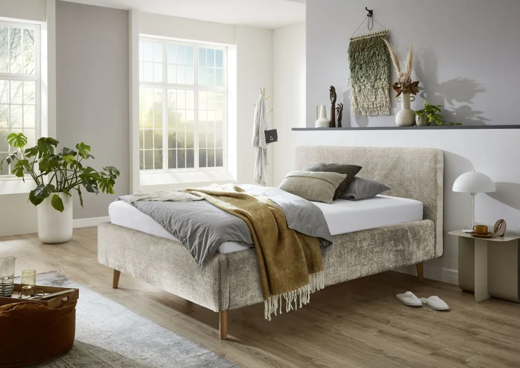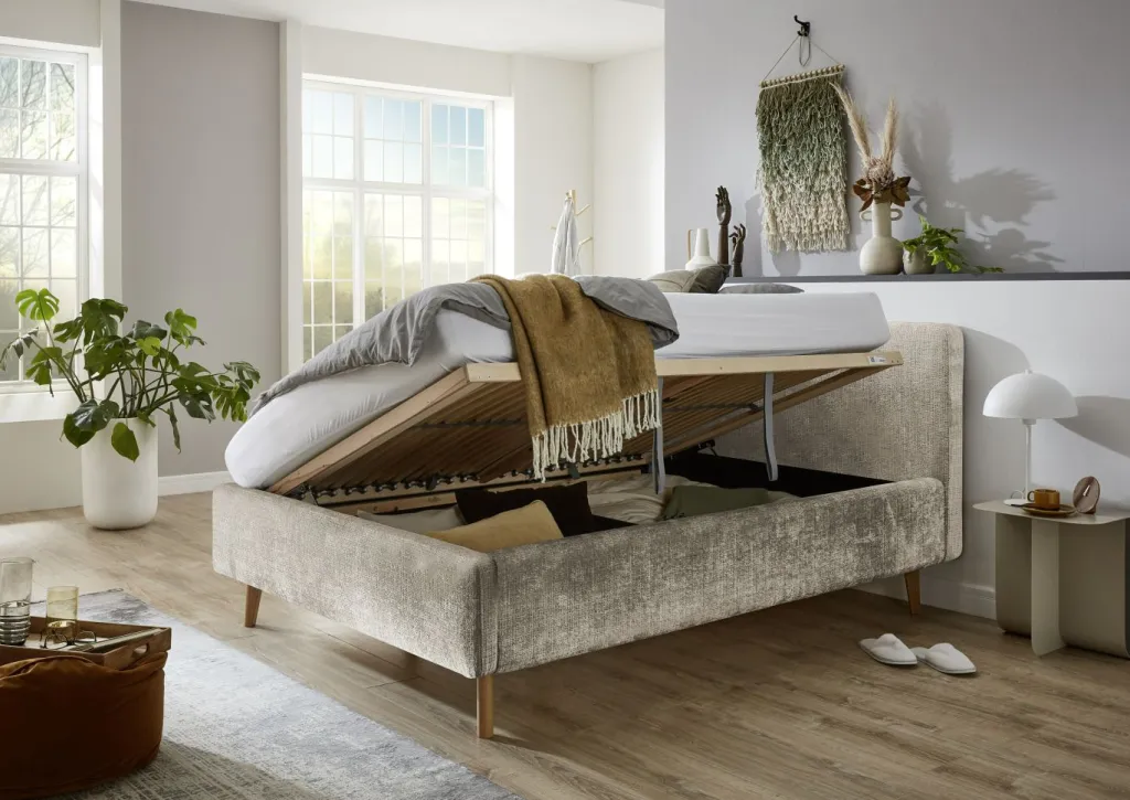 inclus : un coffre de lit avec aération et sommier à lattes en bois multiplis avec ouverture latérale