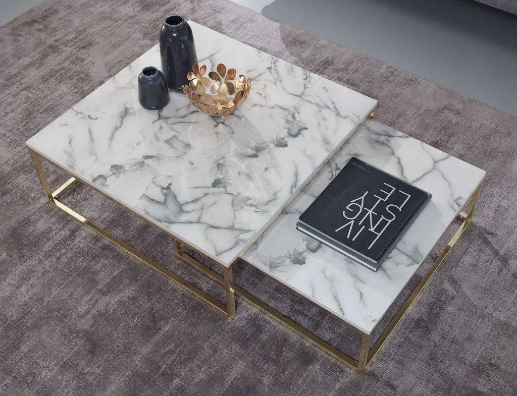 Plateau de table : MDF filmé avec revêtement PVC aspect marbre ultra brillant ton blanc