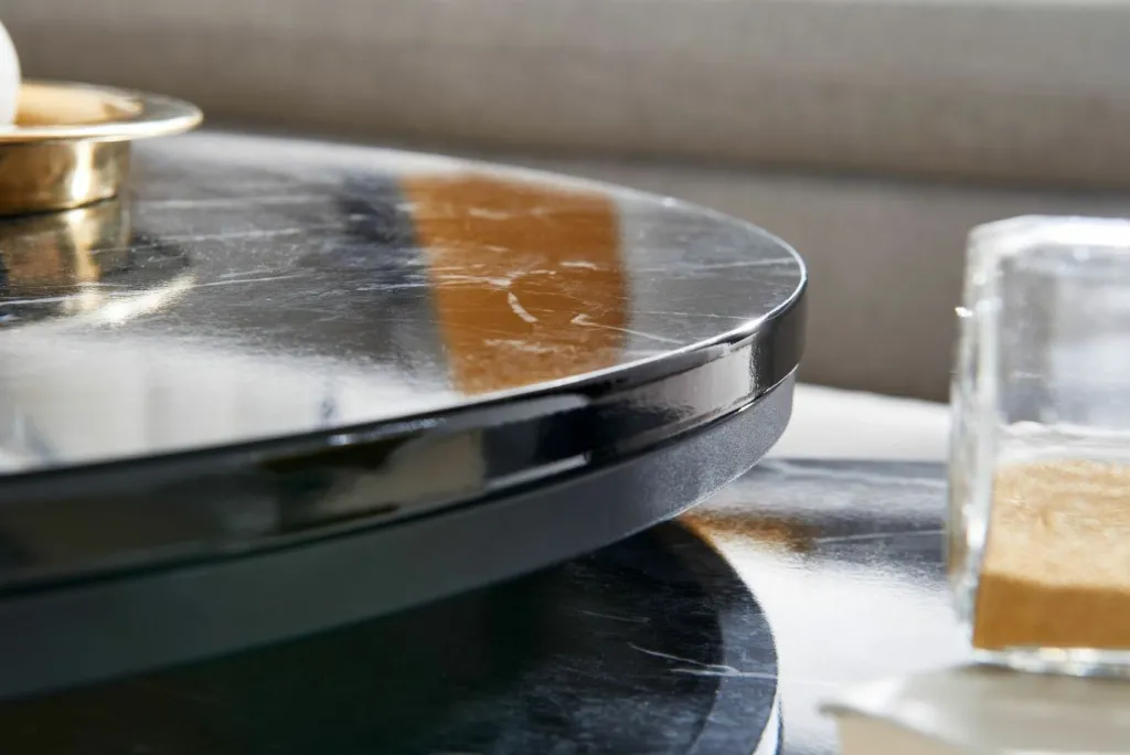 Plateaux : MDF (panneau de fibres de bois de densité moyenne) pelliculé aspect marbre noir ultra brillant
