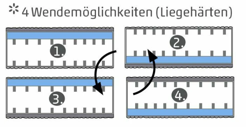 Suivant le positionnement de l’âme ou de la housse, le degré de fermeté peut être choisi individuellement (4 possibilités en tournant et retournant le matelas = 4 degrés de fermeté différents).