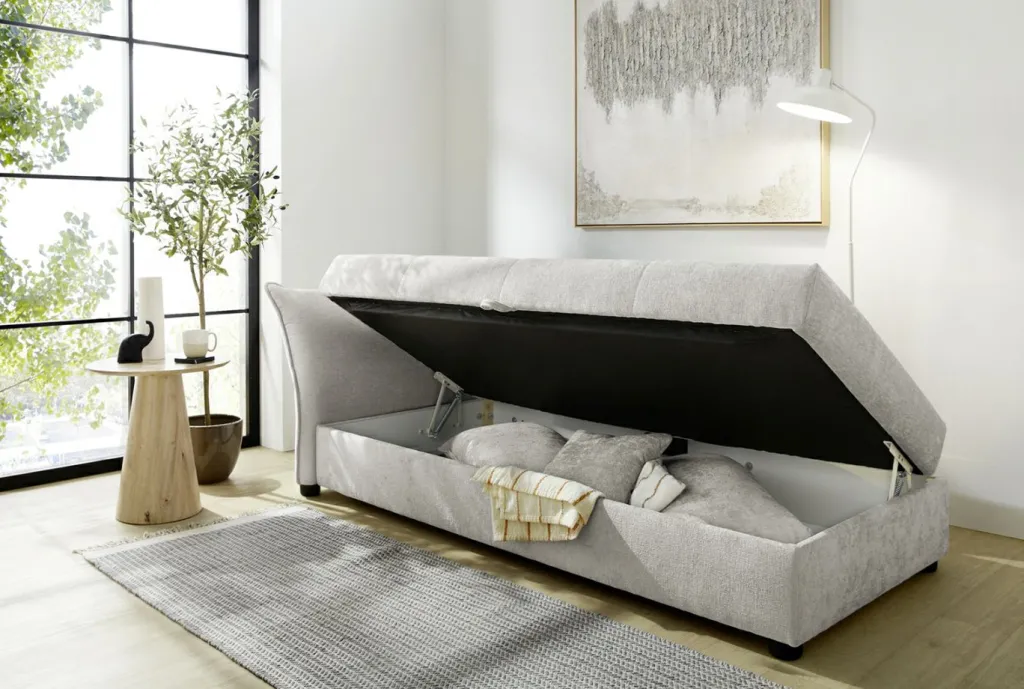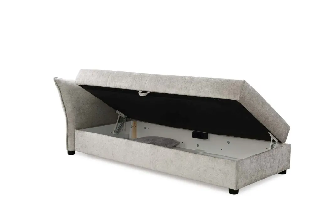 Le coffre de lit intégré offre un bel espace de rangement et s’ouvre facilement grâce au mécanisme à ressorts