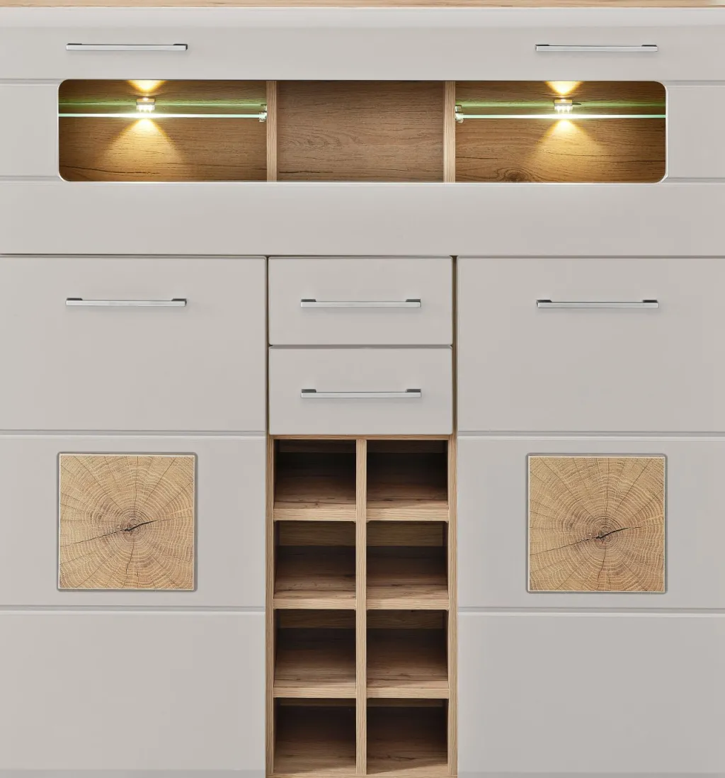 Façade : MDF (panneau en fibre de bois de densité moyenne) ton cachemire mat avec contrastes décor bois de bout / verre transparent