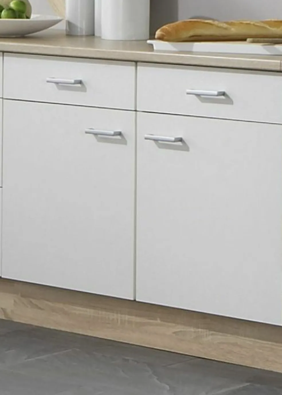 Issu de la jolie cuisine SONEA, voici : un meuble bas dans les jolis tons : blanc/ décor chêne Sonoma avec deux tiroirs