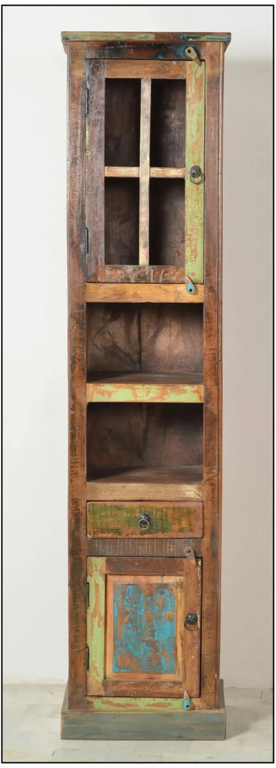 Vieux bois véritable massif (Inde), laqué ton multicolore / verre
