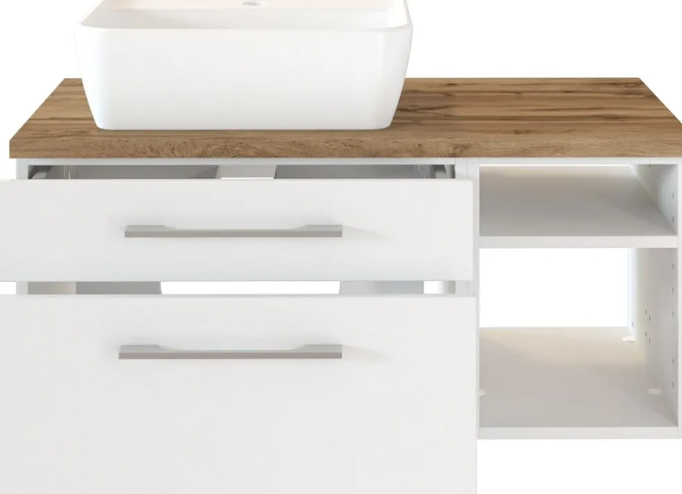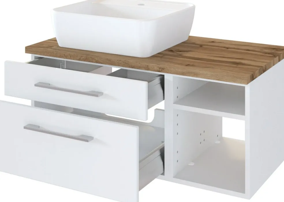1 meuble sous vasque avec 1 tiroir bas et 1 tiroir haut avec fermeture amortie et 2 casiers ouverts, incl. découpe siphon