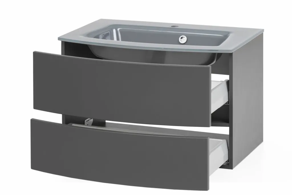 1 meuble sous vasque avec 2 tiroirs en métal à sortie totale avec fermeture amortie, façades arrondies