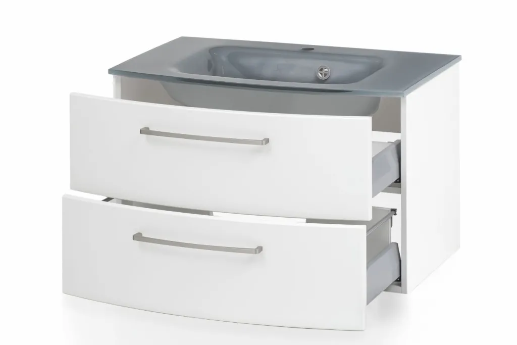 1 meuble sous vasque avec 2 tiroirs à fermeture amortie (à sortie totale), tiroir inférieur avec barres latérales, avec façades arrondies