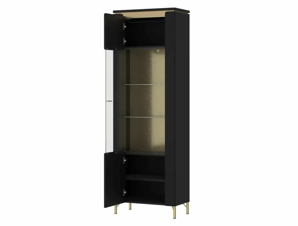 Caisson : ton noir et contrastes ton doré, plateau en MDF, panneau de particules surfacé mélaminé (PPSM)