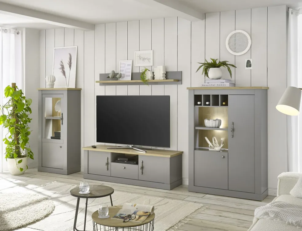 1 banc TV avec 1 casier pour l’équipement, 1 passe-câble, 1 tiroir et 2 portes