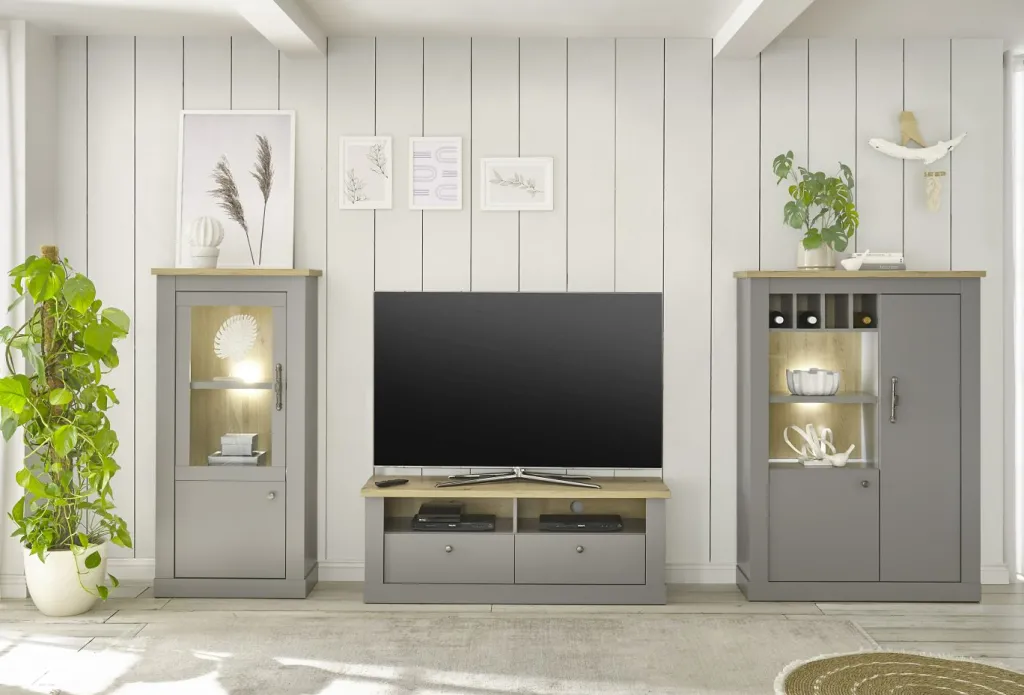 1 banc TV avec 2 casiers pour l’équipement, 2 passe-câbles et 2 tiroirs