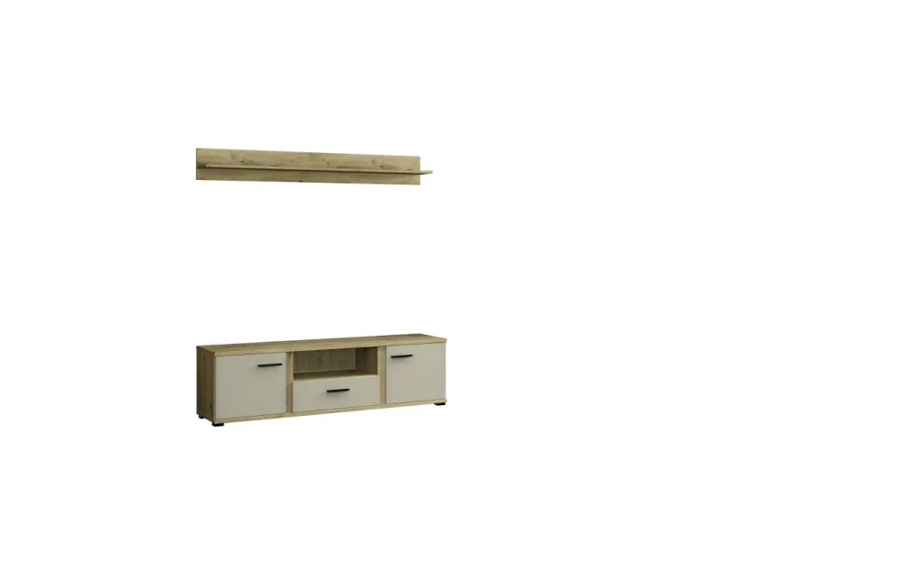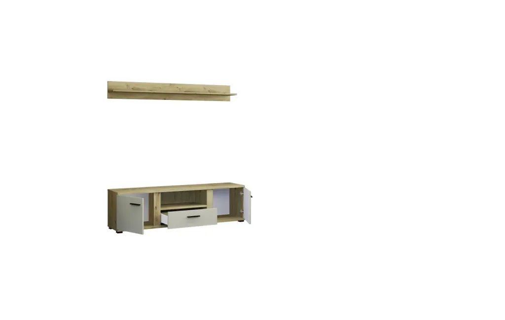 1 banc TV avec 2 portes, 1 tiroir avec coulisses inférieures, 1 casier ouvert et 1 passe-câble