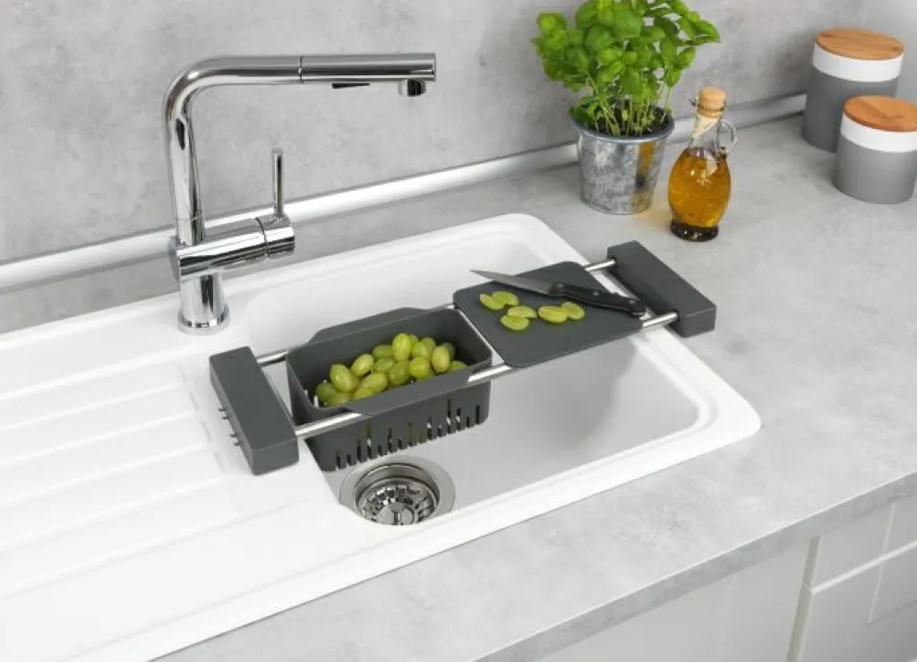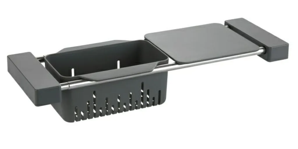 Maintenir l’ordre pour être de bonne humeur : le caddy d’évier ultra pratique Cami est la place idéale pour ranger et faire sécher de façon décorative liquide vaisselle, éponge, lavette et brosse à vaisselle. Chez WENKO, nous avons à cœur que votre plan de travail reste propre et ordonné. L’égouttoir multifonction Cami permet de maintenir l’ordre et a été conçu pour offrir un espace de travail supplémentaire au-dessus de l’évier. Et ceci signifie donc aussi plus d’espace libre autour de l’évier. La vaisselle est tellement plus agréable quand on a tout à disposition. Grâce au support réglable, l’accessoire de cuisine ultra pratique s’adapte à tous les éviers. Les rails en acier inoxydable de qualité sont extensibles en continu de 43,5 cm à 77,5 cm. Le support de rangement rétractable pour évier est astucieux et polyvalent puisqu’il est à la fois rangement d’évier, passoire et planche à découper tout-en-un. Vous pouvez ainsi laver les fruits et les légumes directement dans la passoire et les laisser sécher pour les découper ensuite sur la planche à découper. Et tout cela directement au-dessus de l’évier. La passoire et la planche à découper sont fabriquées en polypropylène robuste, les pieds avec revêtement antidérapant sont en élastomère thermoplastique (TPR).