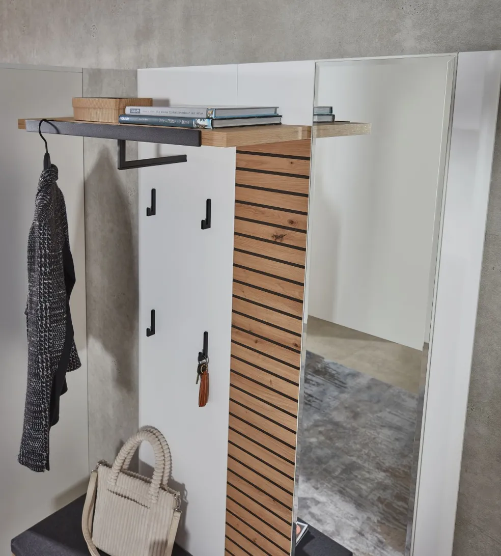 Façade : MDF (panneau de fibres de bois de densité moyenne) ton blanc mat et contrastes MDF décor chêne Artisan aspect lattes de bois / miroir