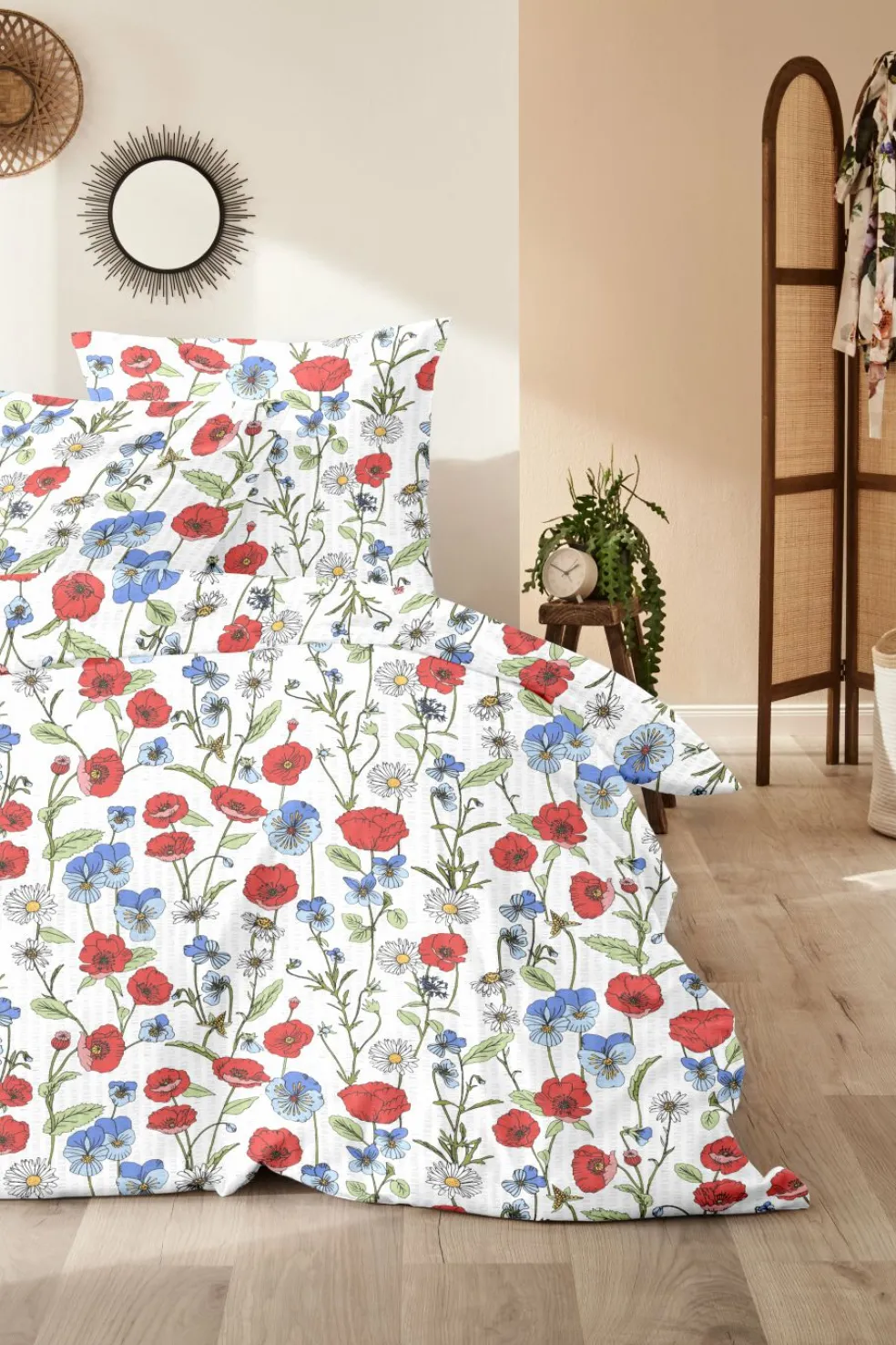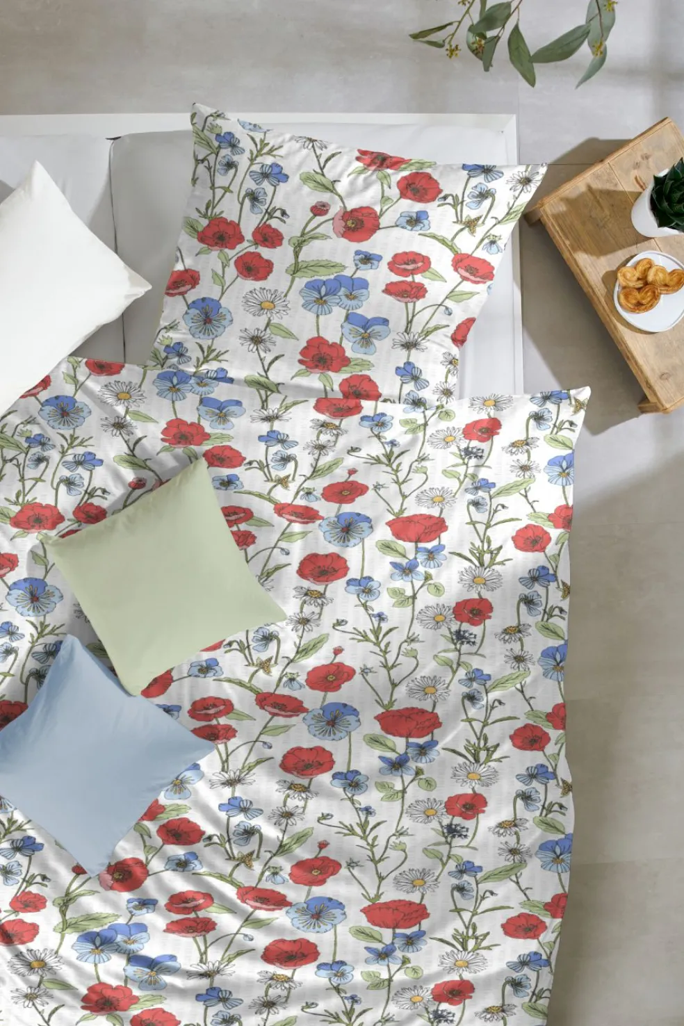 Coloris : avec des motifs de fleurs dans les tons blanc, bleu et rouge