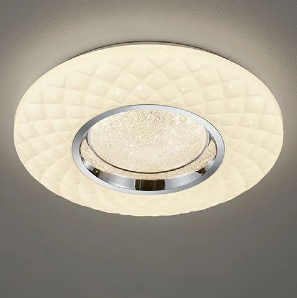 Le plafonnier MAGNOLIA garantit un design lumineux dans sa forme la plus parfaite. La lampe LED ronde sait se transformer pour s’adapter à tous vos souhaits en matière d’éclairage. Grâce à son design moderne, le luminaire attirera rapidement tous les regards dans votre intérieur. Le plafonnier blanc a un diamètre de 39 cm. La forme ronde apporte la touche finale au style harmonieux du plafonnier. La lampe dispose d’un variateur SWITCH intégré. Ce variateur permet de régler l’intensité lumineuse sur 3 niveaux à l’aide de la télécommande fournie pour augmenter la sensation de bien-être dans vos pièces. Ainsi, le plafonnier peut être utilisé de multiples façons. L’abat-jour annulaire de la lampe imite un ciel étoilé qui conférera à la pièce un charme irrépressible. De même, la lampe dispose d’une fonction veilleuse. Les jolies couleurs (blanc/chrome) soulignent le design élégant qui s’intègre facilement dans les intérieurs classiques, de préférence, mais qui crée également un contraste stylé bienvenu dans les intérieurs modernes. La lampe dispose, en outre, de la technologie LED qui se caractérise par une luminosité de qualité et une excellente efficacité énergétique. Ceci permet d’économiser 80 % des coûts énergétiques par rapport aux ampoules halogènes habituelles. De plus, les sources lumineuses LED ont une durée de vie accrue, produisent moins de chaleur et participent à la protection de l’environnement.