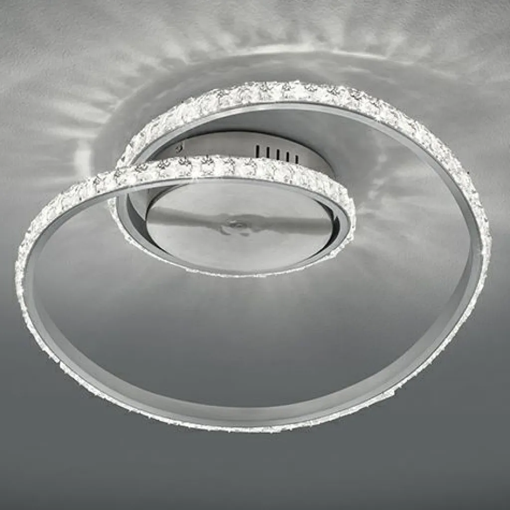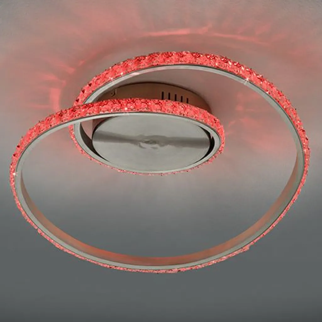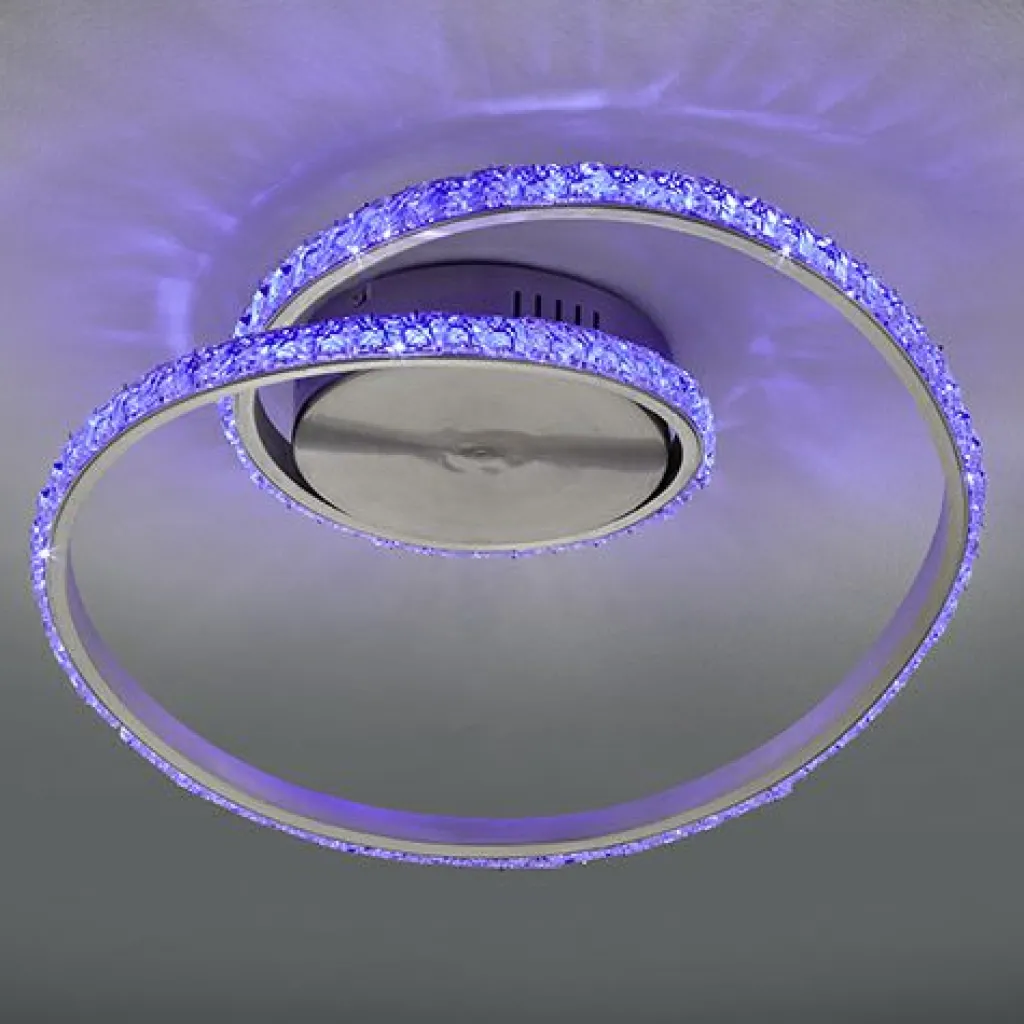 Le plafonnier RUBIN fera entrer la couleur de votre intérieur ! Grâce au système de changement de couleur RGBW intégré, il est possible de choisir un grand nombre de coloris à l’aide de la télécommande. De plus, le plafonnier dispose d’une fonction veilleuse et l’intensité lumineuse peut également être réglée en continu de sorte que vous pourrez adapter individuellement la lumière en fonction de l’ambiance souhaitée. Le design original à cristaux attirera tous les regards dans votre pièce de vie. Le plafonnier tendance a une largeur de 45cm et une profondeur de 38 cm. La teinte chrome et la surface à cristaux créent un contraste stylé avec les différentes couleurs de lumière et apporte la touche finale à l’ensemble. La lampe dispose, en outre, de la technologie LED qui se caractérise par une luminosité de qualité et une excellente efficacité énergétique. Ceci permet d’économiser 80 % des coûts énergétiques par rapport aux ampoules halogènes habituelles. De plus, les sources lumineuses LED ont une durée de vie accrue, produisent moins de chaleur et participent à la protection de l’environnement.