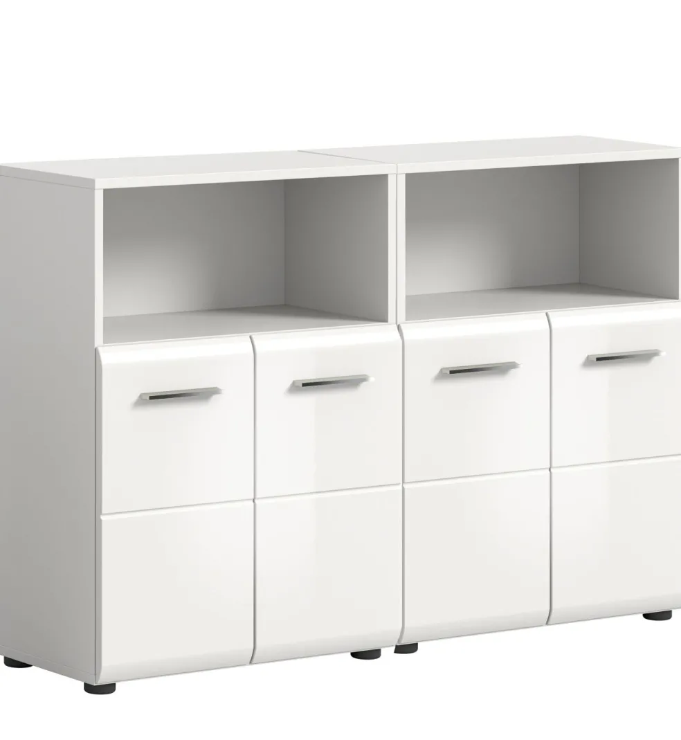 2 meubles de salle de bains avec 1 casier ouvert, 2 portes et 1 tablette amovible chacun