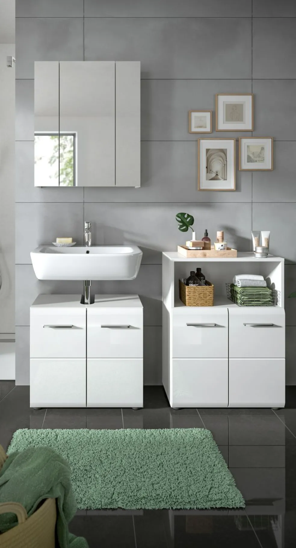 1 meuble de salle de bains avec 1 casier ouvert, 2 portes et 1 tablette amovible