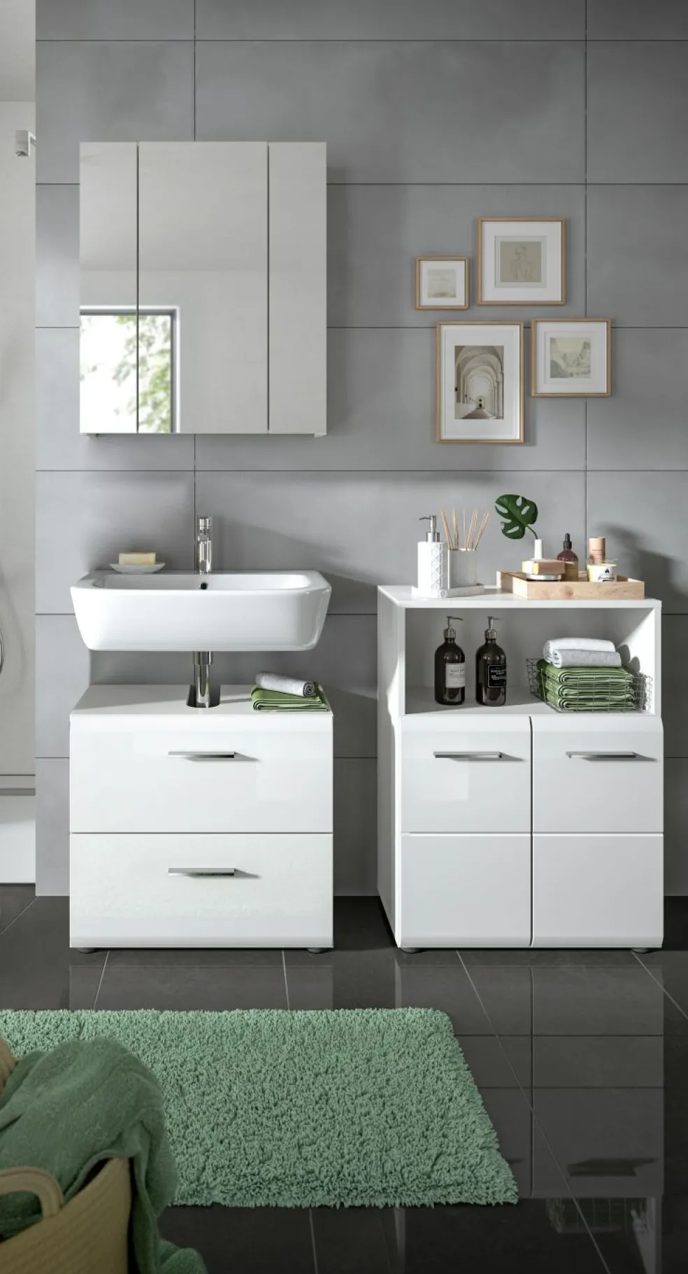 1 meuble de salle de bains avec 1 casier ouvert, 2 portes et 1 tablette amovible