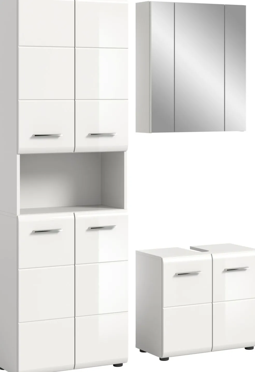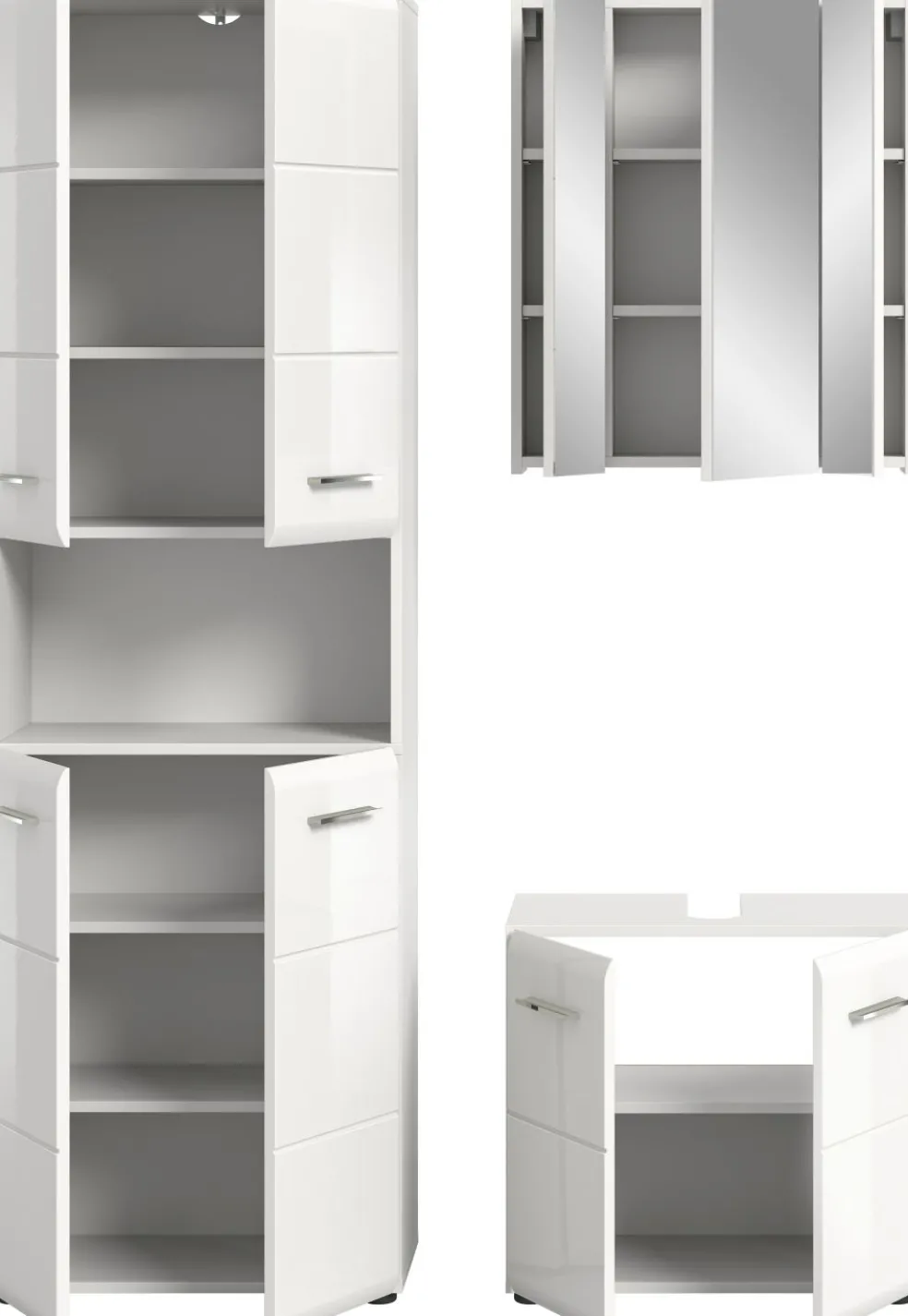 1 colonne de salle de bains avec 4 portes, 3 tablettes amovibles et 1 casier ouvert