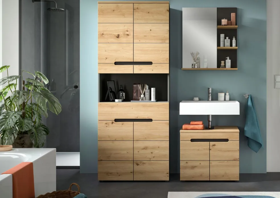1 colonne de salle de bains avec 4 portes, 1 tiroir, 1 casier ouvert et 2 tablettes amovibles