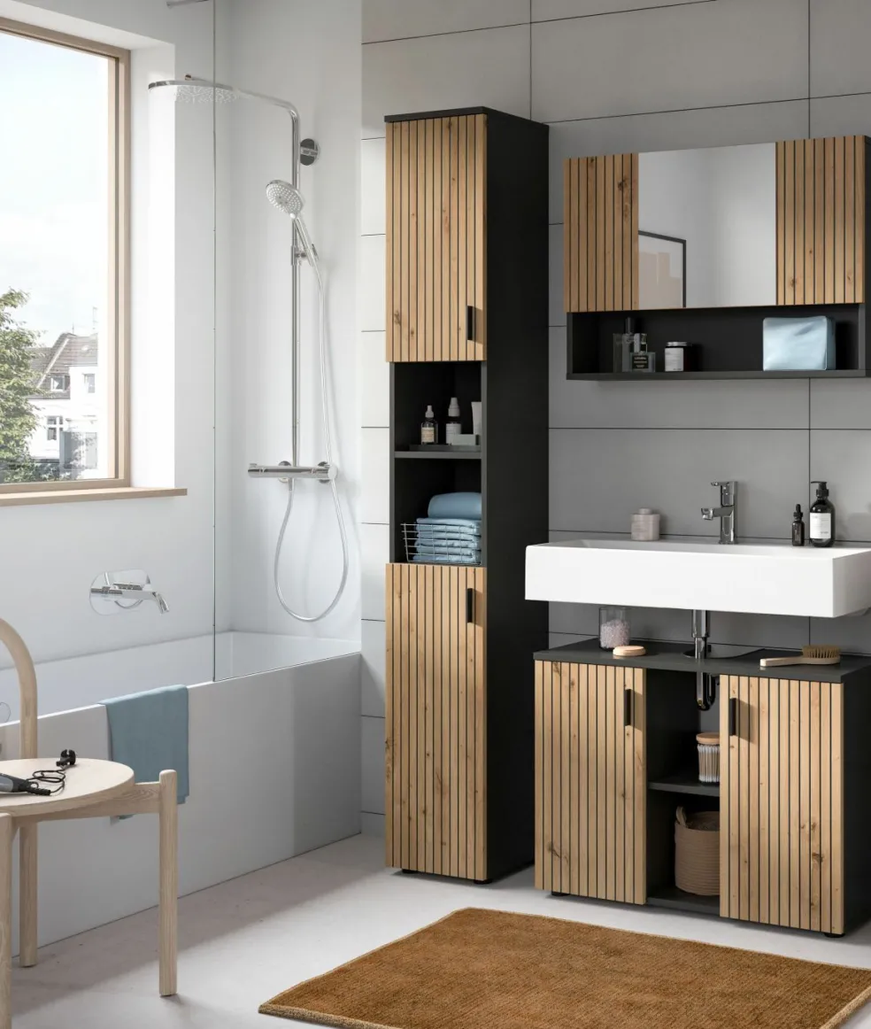 1 colonne de salle de bains avec 2 portes, 3 tablettes amovibles et 2 casiers ouverts